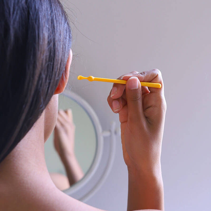 Utilisez la petite cuillère de notre Oriculi pour retirer le cérumen visible à l’entrée de l’oreille uniquement. Pas besoin d’aller plus loin, le cérumen est un atout puisqu’il protège le tympan, donc autant le conserver tant qu’il n’est pas inesthétique.